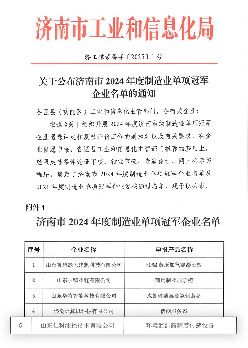 近日,濟南市工業和信息化局公布了《2024年度濟南市制造業單項冠軍企業》名單,山東仁科憑借過硬的技術實力和創新能力在一眾企業中脫穎而出,成功入選。