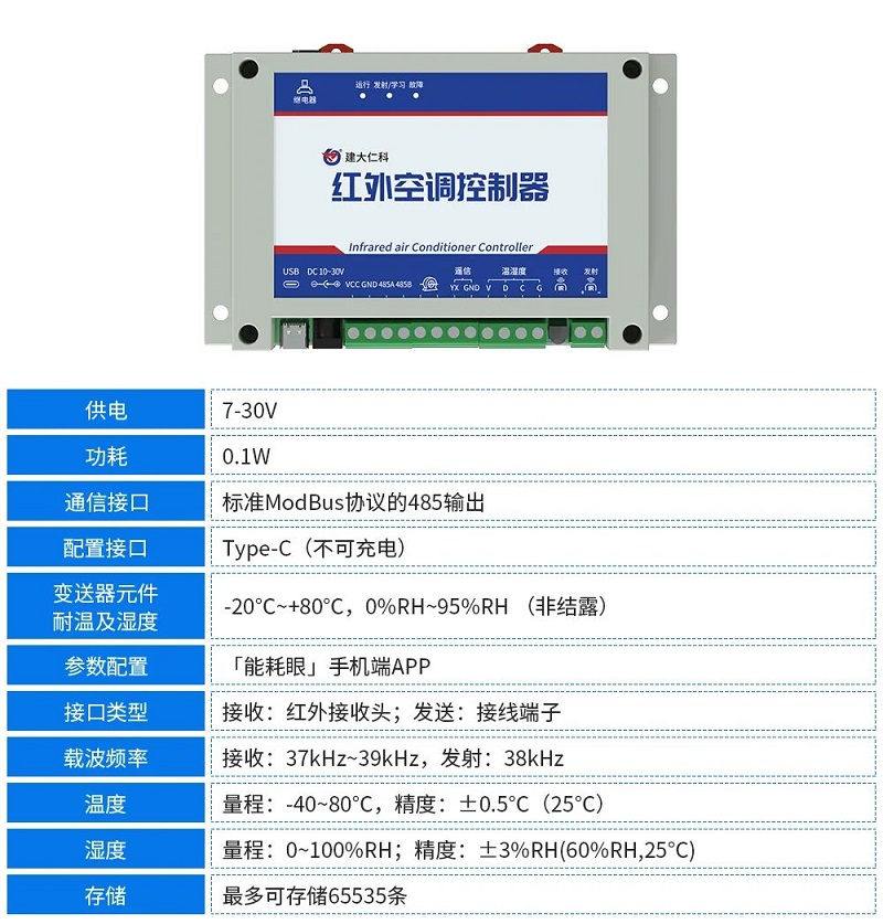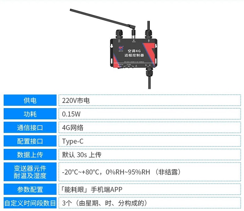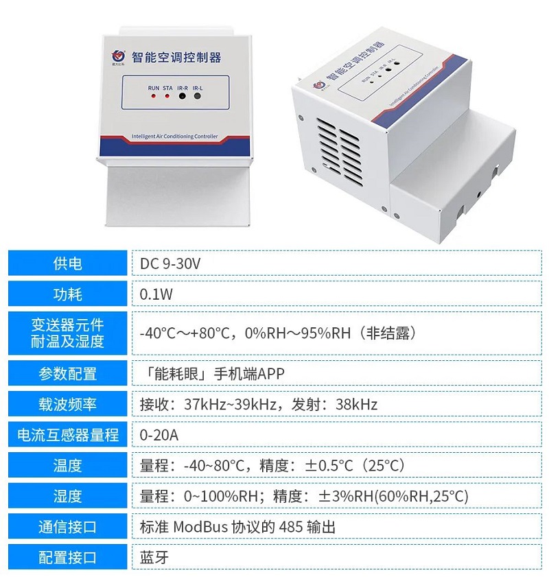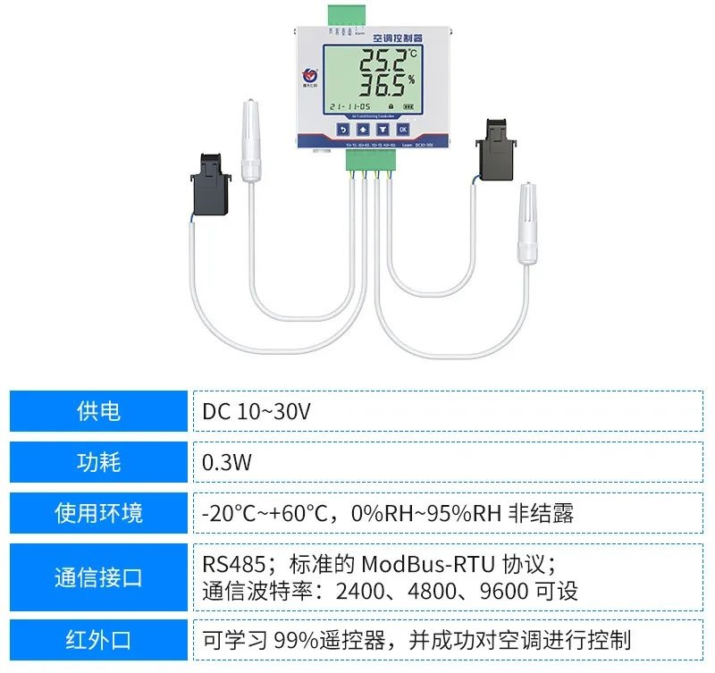 紅外空調控制器最多可學習 139組紅外碼;擁有周期控制、遙信控制、溫濕度控制、定時控制、遠程控制多種模式可選,還可以進行溫濕度+定時、遙信+定時、周期+溫濕度的組合控制;自帶存儲功能,能夠記錄空調用電總量、開關機控制失敗以及溫濕度超過上下限等內容,通過手機配置 APP 導出記錄,方便快捷。