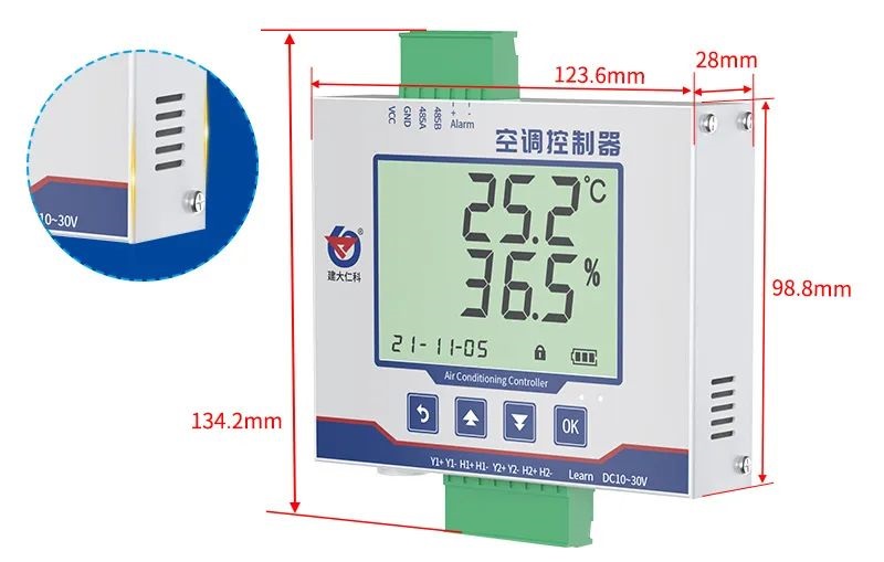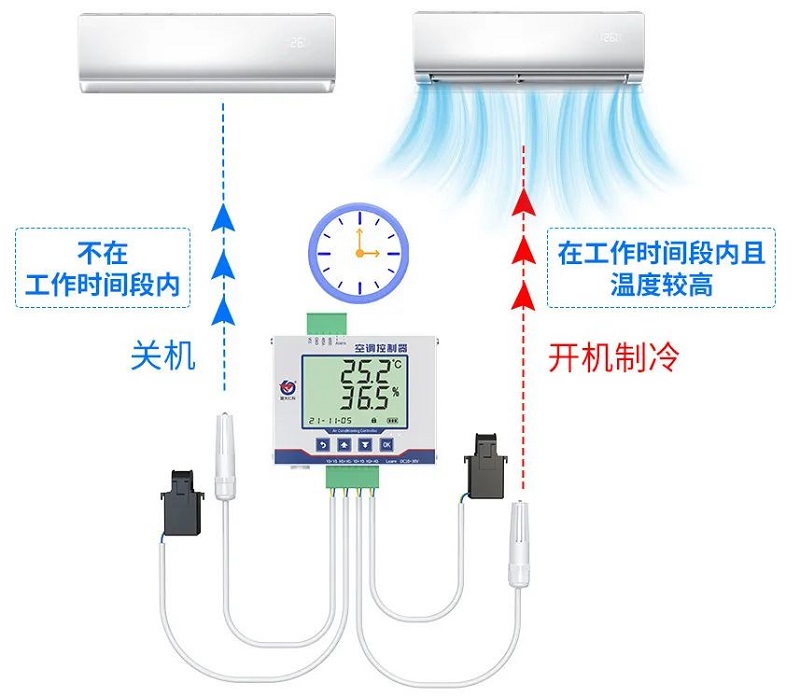 壁掛式空調控制器內置高精度溫濕度傳感器,采用工業級測量芯片,配備高清液晶顯示屏,可實時顯示當前環境數據,解決了傳統空調控制器無法獲取實際環境參數的痛點,實現“所見即所控”的精準調節;同時支持遠程數據采集,解決了大型場所需要人工巡檢記錄環境數據的低效問題,避免了傳統空調依賴設定溫度而非實際溫度導致的能源浪費問題。