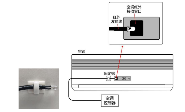 發射頭的自粘扣固定:使用自粘扣將探頭卡住后,粘至空調接收位置。
