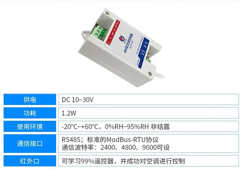 山東仁科一個壁掛型空調控制器擁有兩個紅外發射探頭,紅外發射延長線可達 5 米,可同時控制兩路空調,帶有RS485接口,通信距離最遠可達2000米),支持ModBus-RTU協議,對于支持此協議的主機(PLC、單片機控制系統、力控、組態王、昆侖通態等組態軟件)均可以通過設備對多個空調進行控制,從而達到一對多(一個主機控制多個空調)的控制目的,解決集中管控困難,遙控器冗余問題。
