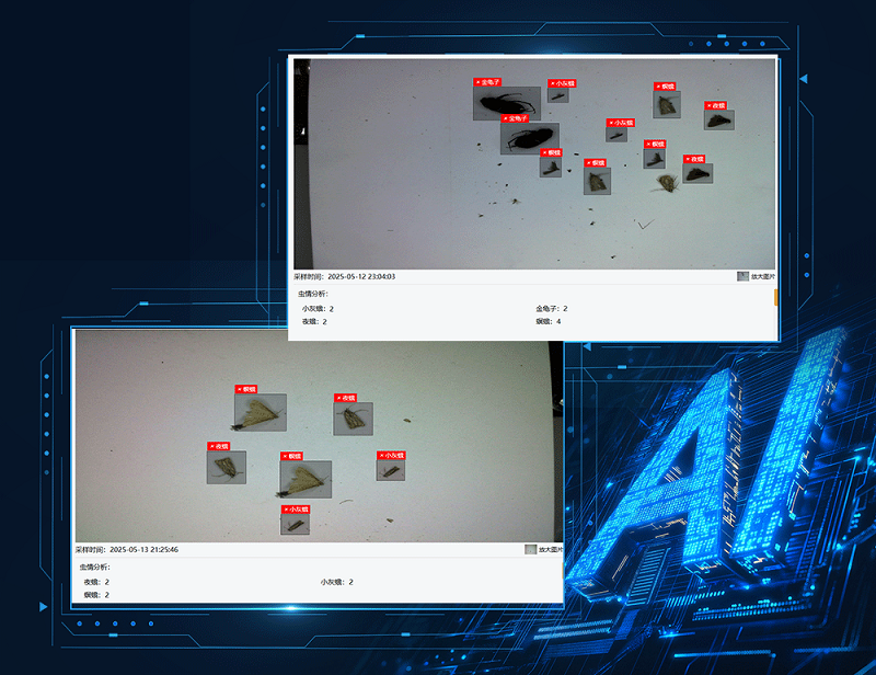 2- 結(jié)合AI圖像優(yōu)化算法,消除運(yùn)動(dòng)拖影,實(shí)現(xiàn)蟲體高清還原;數(shù)據(jù)庫上萬害蟲模型對比,可自動(dòng)標(biāo)注害蟲種類并分類計(jì)數(shù);解決了傳統(tǒng)蟲情監(jiān)測依賴人工目視判別,存在夜間無法作業(yè)、微小蟲體漏檢、種類誤判率高等痛點(diǎn)。