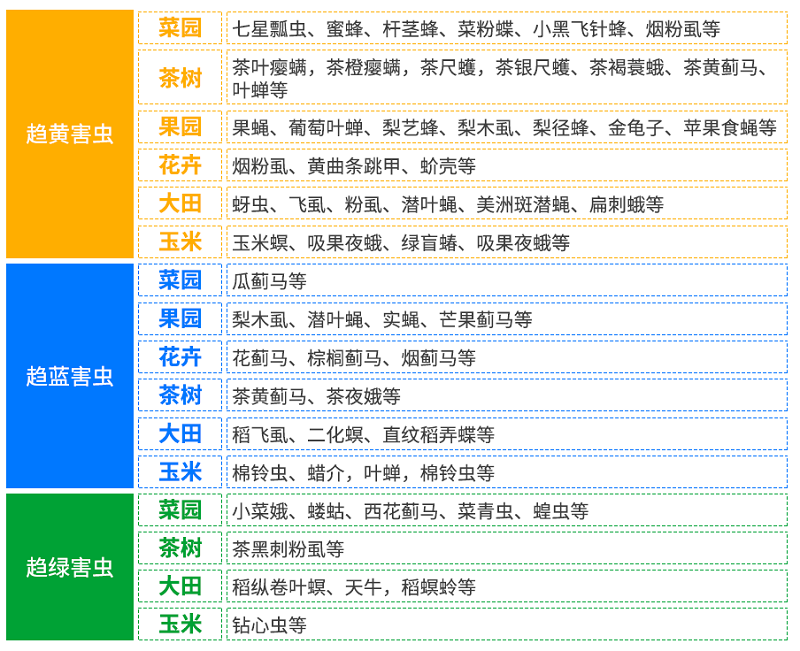 昆蟲在長期的進(jìn)化過程中產(chǎn)生了對色彩的趨性,也稱為“色覺”。這類害蟲多在白天活動(dòng),不同害蟲對色彩的趨性也有特定的選擇和愛好,且不同性別和發(fā)育階段均可有差異。