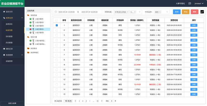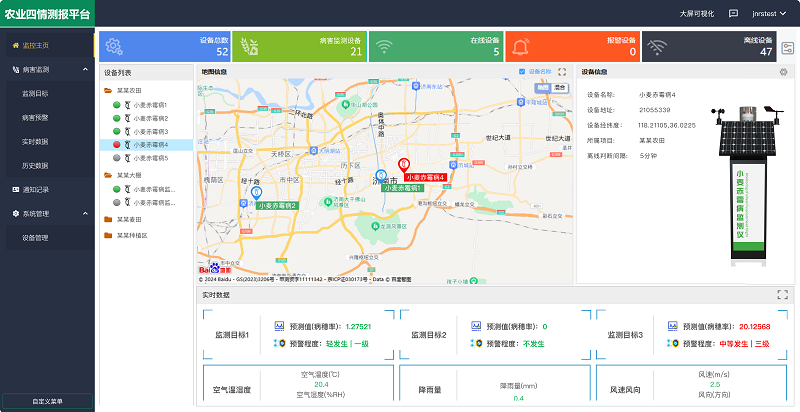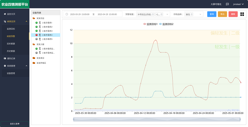 農(nóng)業(yè)四情測報(bào)平臺(tái) 是山東仁科回饋用戶的免費(fèi)綜合管理平臺(tái),其中 病害監(jiān)測板塊包括【監(jiān)測目標(biāo)】【病害預(yù)警】【實(shí)時(shí)數(shù)據(jù)】【歷史數(shù)據(jù)】四個(gè)子版塊,真正實(shí)現(xiàn)病蟲害防控的智能化、協(xié)同化、高效化,為現(xiàn)代農(nóng)業(yè)植保提供全方位的數(shù)據(jù)支撐。