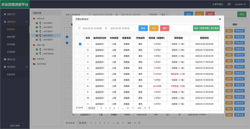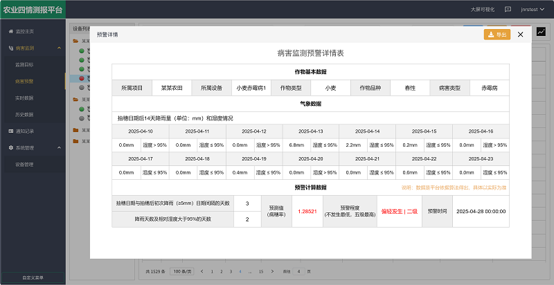 用戶可以通過平臺(tái)自定義設(shè)置監(jiān)測目標(biāo),填寫小麥品種(春性、半冬性、冬性)、生長周期(抽穗日期)及監(jiān)測周期等,平臺(tái)會(huì)根據(jù)內(nèi)置算法自動(dòng)生成生成《病害監(jiān)測預(yù)警詳情表》,內(nèi)容包括氣象數(shù)據(jù)、預(yù)測值和預(yù)警等級(jí)(由低到高依次為不發(fā)生/輕發(fā)生(一級(jí))/偏輕發(fā)生(二級(jí))/中等發(fā)生(三級(jí))/偏重發(fā)生(四級(jí))/大發(fā)生(五級(jí)))等,一旦預(yù)警等級(jí)超過上限,會(huì)通過數(shù)據(jù)變紅、短信、語音、郵件的形式在指定時(shí)間向用戶進(jìn)行預(yù)警,確保用戶獲取最新預(yù)警信息。