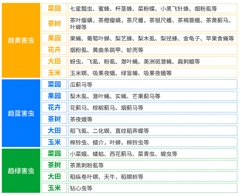 在長期的進化過程中,昆蟲形成了對色彩的趨性(即"色覺")。這類昆蟲多在白天活動,而市面上常見的害蟲誘捕設(shè)備主要在夜間工作、白天待機,因此對這些害蟲的誘捕效果微乎其微。