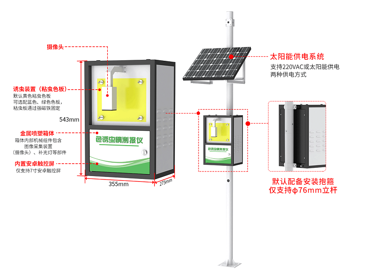 色誘蟲情測報儀主要由“金屬噴塑箱體、安卓主控系統(tǒng)、高清攝像頭、誘蟲裝置(黃/監(jiān)/綠粘蟲色板)、色板固定裝置、安裝底座(選配)、太陽能供電系統(tǒng)(選配)”等部件組成。