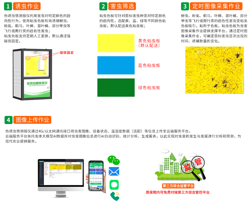 色誘蟲情測報儀采用可定期更換的黃、藍、綠三色粘蟲板,專門誘捕具有趨色性的飛行或爬行類害蟲。該設(shè)備基于溫控、時控及平臺聯(lián)網(wǎng)控制技術(shù),結(jié)合機械組件與高清攝像頭,可在無人值守狀態(tài)下自動完成害蟲誘捕滅殺和定時圖像采集等系統(tǒng)作業(yè)。采集數(shù)據(jù)實時上傳至【農(nóng)業(yè)四情測報平臺】后,依托平臺的【蟲體大模型AI數(shù)據(jù)庫】,對蟲害圖像進行【AI自動識別、統(tǒng)計分析和報表生成】,從而實現(xiàn)對蟲害發(fā)生發(fā)展態(tài)勢的精準(zhǔn)預(yù)測。該設(shè)備兼具蟲害標(biāo)本采集和蟲情分析預(yù)測雙重功能,為現(xiàn)代農(nóng)業(yè)提供智能化蟲害監(jiān)測解決方案。