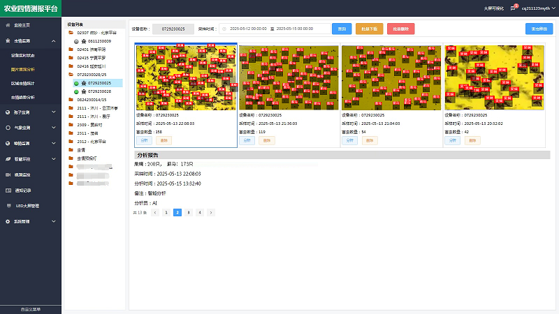 色誘蟲情測報儀支持4G/以太網(wǎng)的數(shù)據(jù)傳輸方式,可與農(nóng)業(yè)四情測報平臺搭配使用。平臺擁有“蟲體大模型AI數(shù)據(jù)庫”,用戶在平臺查看害蟲照片的同時,利用平臺AI自動分析功能(可識別99.99%的害蟲種類)對害蟲進行分類計數(shù)并生成報表,平臺可根據(jù)目標(biāo)害蟲的發(fā)展情況,對用戶進行“微信、短信、郵件、語音”遠程預(yù)警提醒,以便用戶及時用藥,做好蟲害防治。