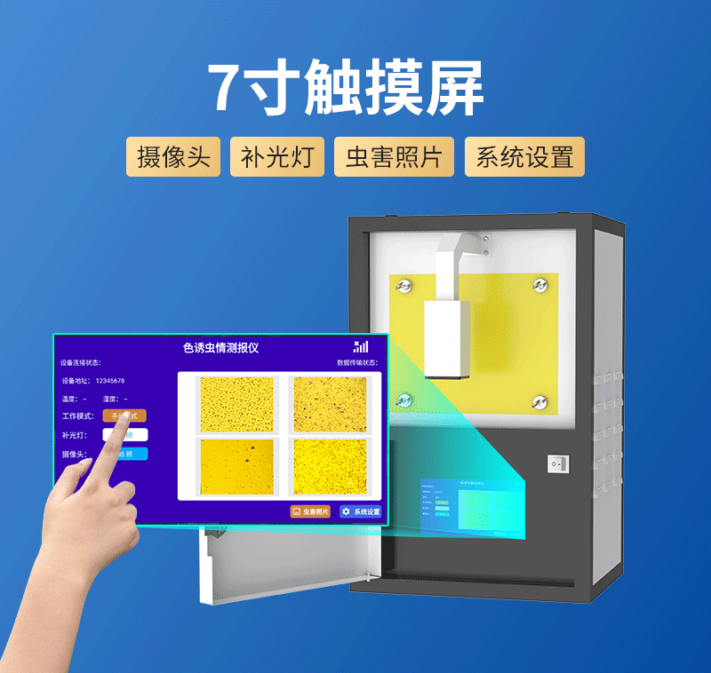 現(xiàn)場控制:色誘蟲情測報儀配備7寸觸摸屏,觸摸屏可實時顯示關(guān)鍵信息,如工作模式、通訊狀態(tài)、蟲害照片等,極大簡化了設(shè)備的監(jiān)控流程,用戶還可直接通過觸摸屏開關(guān)設(shè)備及設(shè)置相關(guān)參數(shù)等。