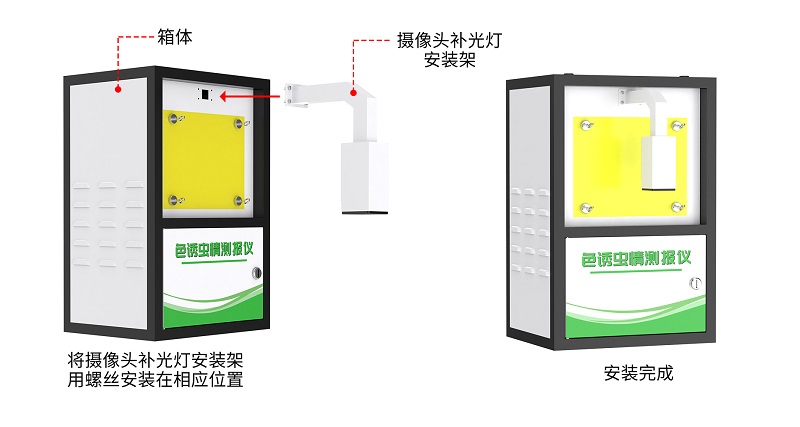 用戶只需將色誘蟲情測報儀箱體從包裝箱內(nèi)取出,對照使用說明書的裝箱單仔細清點,檢查設(shè)備附件是否齊全后,將攝像頭補光燈安裝架用螺絲安裝在相應(yīng)位置即可。