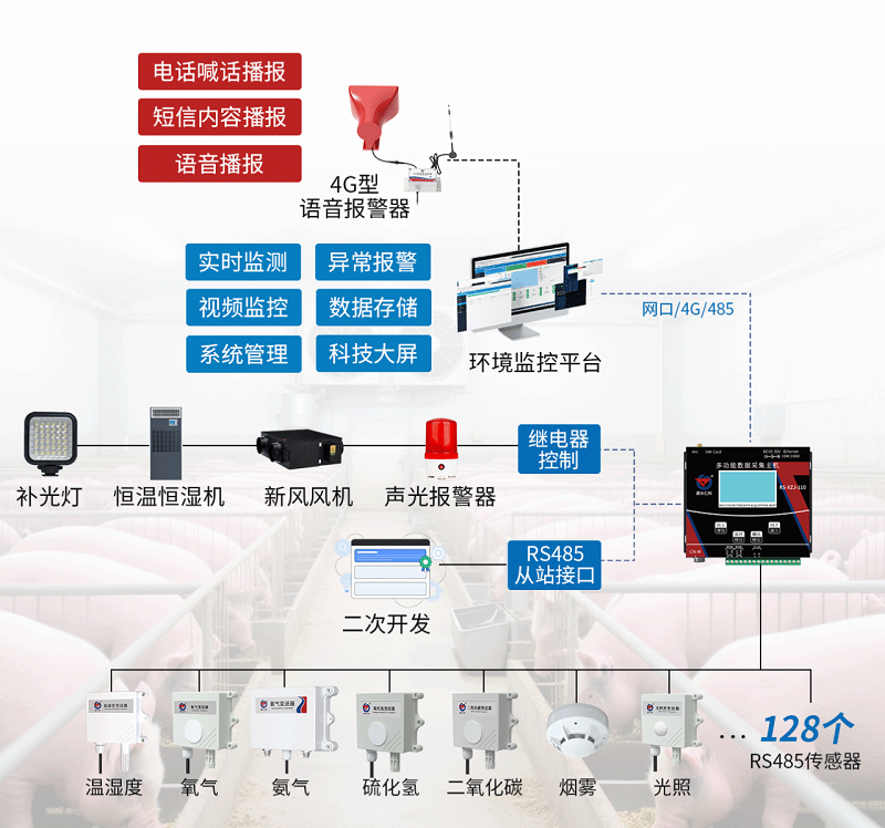 用戶還可以通過配置4G型語音報警器,實現(xiàn)語音播報、電話喊話播報和短信內(nèi)容播報,以便及時調(diào)控,為禽畜營造更好的生長環(huán)境。