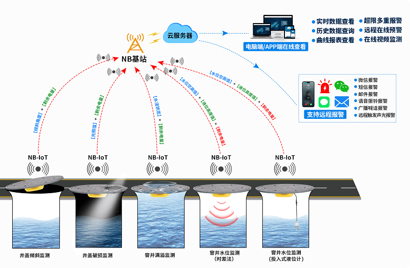 智能井蓋監測系統具備智能報警功能。報警信息可通過平臺數據變紅、平臺告警彈窗、電話、短信、郵件等渠道實時推送至相關人員,以便問題被及時發現和處理。這種主動式的安全防范模式,大幅降低了井蓋安全隱患演變為事故的風險,構建起城市安全的數字化防線。