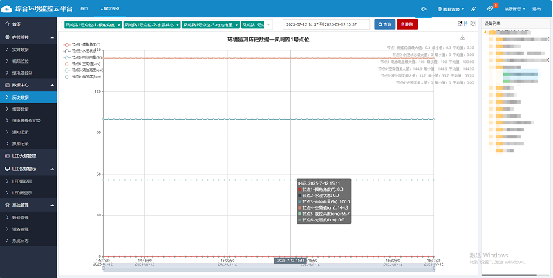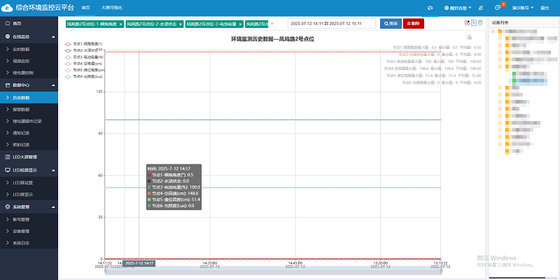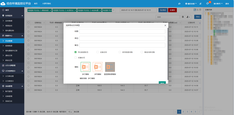 環境監控云平臺具備歷史數據查詢功能。平臺不僅可以記錄所有監測點的歷史監測數據,還支持一鍵導出報表功能,簡化了數據匯總流程。通過長期監測數據的積累與分析,管理人員可科學評估地下管網排水能力與城市降雨特征的匹配程度,對城市排水系統進行改造升級。