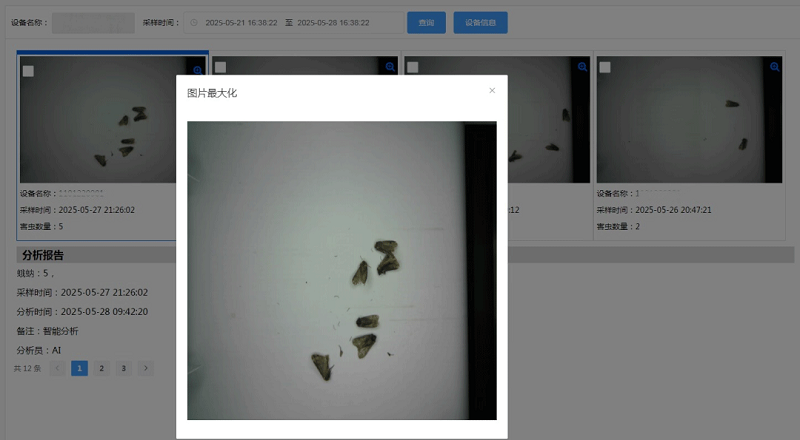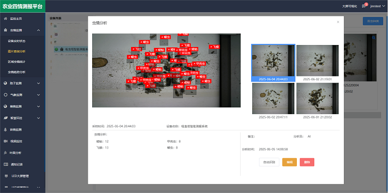 農業四情測報平臺集成了"蟲體大模型AI數據庫"系統,該數據庫基于深度學習算法構建,收錄了上千種農作物害蟲數據。用戶可隨時調取歷史監測圖像,平臺能自動識別害蟲種類并生成詳細分析報告,有效提升病蟲害監測預警效率。