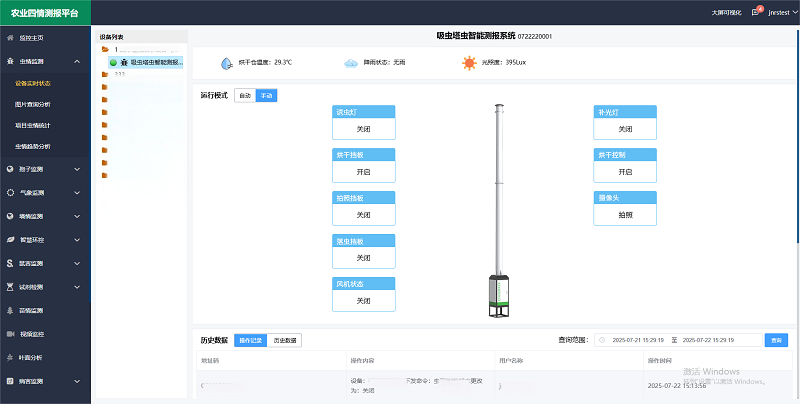 用戶在農業四情測報平臺可查看烘干倉溫度、降雨狀態、光照度等關鍵數據,還可以調整設備各部分的運行狀態,如:運行模式(自動/手動)、誘蟲燈、烘干擋板、拍照擋板、落蟲擋板、風機狀態、補光燈、烘干控制、攝像頭,輕松實現對設備的遠程操作與集中管理。