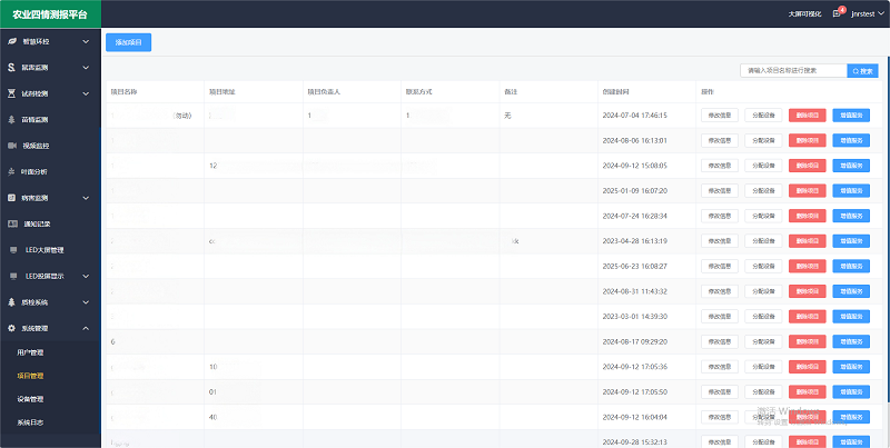 系統管理中具有用戶管理、項目管理、設備管理、系統日志等多個功能,管理員可根據實際使用需求增/減子賬號,進行數據共享;修改設備信息;查看各個人員賬號的登錄、操作情況,以保障項目的正常運行。