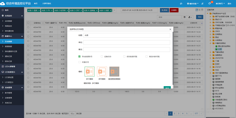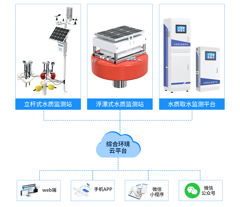 管理人員還可以將水質變送器搭配水質監測站(浮漂式、立桿式、水質取水監測平臺)使用,水質監測站可以將數據上傳至綜合環境云平臺,組成水質監測系統,以便用戶實現對數據的遠程查看及設備的遠程管理。