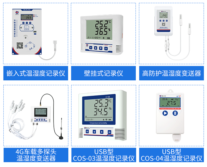 為滿足用戶不同的需求,山東仁科推出了多種溫濕度監測設備類型。從使用場景來看,推出了可用于冷藏保溫箱的嵌入式記錄儀、壁掛式記錄儀、高防護溫濕度變送器;可用于冷藏車的4G車載多探頭溫濕度變送器;專為無信號環境設計的 USB 型記錄儀等設備。