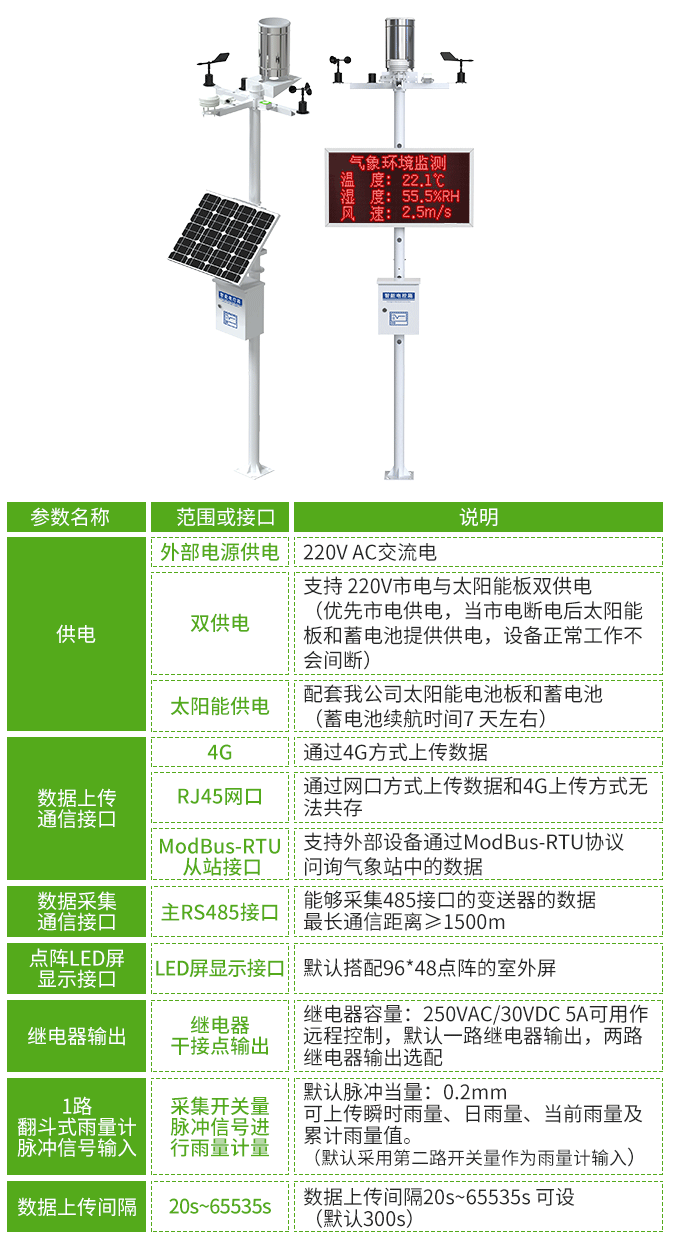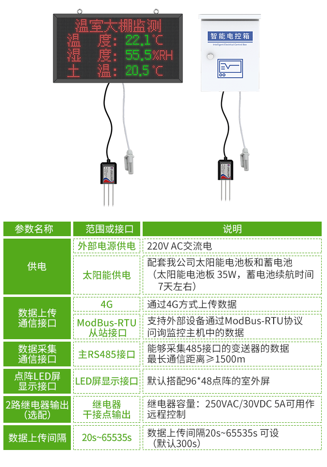 農業室內氣象站支持監測空氣溫濕度、土壤溫度與水分、土壤EC(電導率)與PH值、二氧化碳濃度、光照強度等。針對無市電供應場景的特殊需求,農業室內氣象站可外接大型室外LED單色顯示屏,便于遠距離讀取數據;也可選配太陽能電池板和蓄電池組工作,解決了偏遠地區的長期監測供電難題,確保了監測工作的連續性與穩定性。