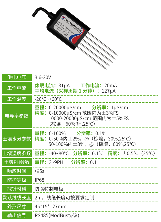 為全面滿足現代農業對土壤監測的多元化需求,最近我公司還新推出了低功耗型土壤變送器,該設備采用先進的低功耗設計,結合高效能量管理技術,顯著延長了設備的使用壽命(使用時間可長達38年),這一超長續航能力大幅降低了設備更換與維護頻率,有效節約了農業生產的長期運營成本,為農田墑情、溫度及鹽分等關鍵參數的連續穩定監測提供了可靠保障,特別適用于大規模農田、偏遠地區及長期野外監測場景。