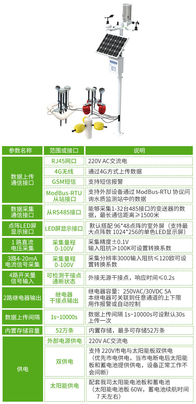 立桿式水質在線監測站是智慧水產養殖中的重要水質監測工具,它采用立桿式結構,可輕松固定安裝于河流、湖泊岸邊監測水溫、酸堿度、電導率、溶解氧等關鍵水質參數(測量要素可自由搭配),并將參數上傳至云平臺,生成詳實報告,為水質分析提供可靠支撐;同時,立桿式水質在線監測站可擴接高清攝像頭和七寸觸摸屏,讓水質管理更高效省心,為水產養殖穩產增收保駕護航。