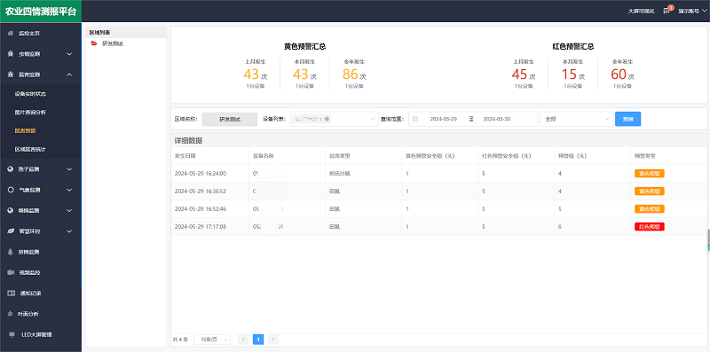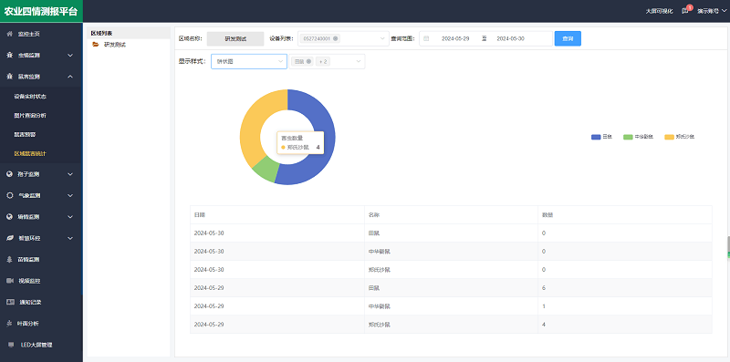 農業四情測報平臺是一個集蟲情、孢子、氣象、墑情、苗情和鼠情監測于一體的在線監控系統,支持氣象與土壤墑情(溫濕度、水分、PH等)的歷史數據查詢和分析;提供鼠情圖片分析、統計及預警,并集成苗情分析、病害識別、葉面分析和遠程繼電器控制等功能,為推進農業現代化、提升生產效益提供了全面的科技支持與技術保障。