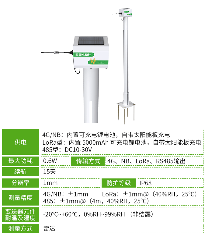 稻田水位計是智慧農業中稻田灌溉管理的專用設備,借助雷達傳感器實時捕捉水位變化,解決傳統人工監測耗時、數據滯后的問題,能快速將數據傳至管理人員,助力及時調整灌溉策略,避免水資源浪費或稻田缺水,為稻田營造適宜水分環境。