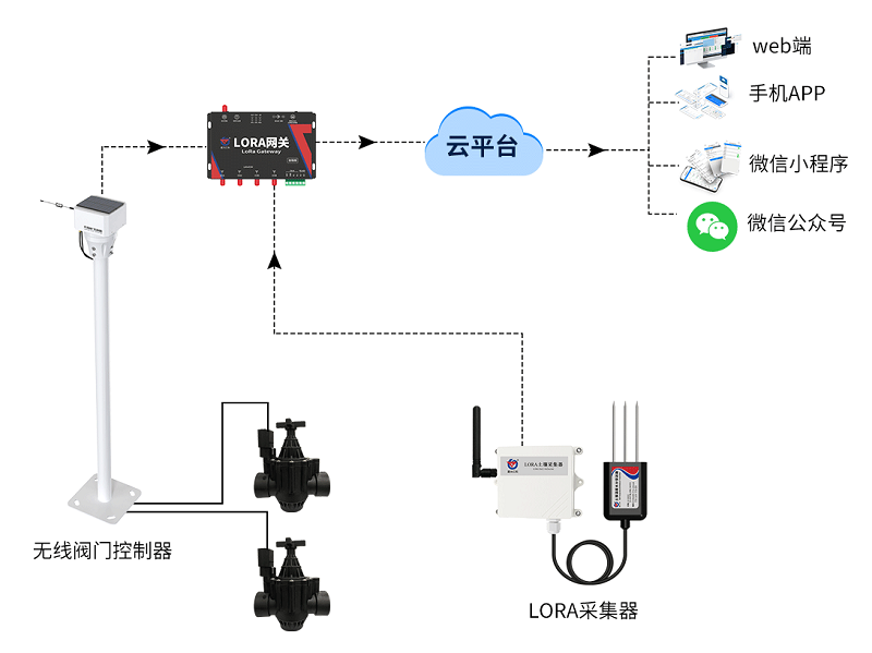 智慧農業無線灌溉系統由LORA網關、LORA土壤采集器、灌溉閥門及農業云平臺組成。該系統主要將采集到的農業環境數據通過4G/以太網等方式上傳到農業云平臺上,進行實時數據的查看及控制(手動/自動/定時)。