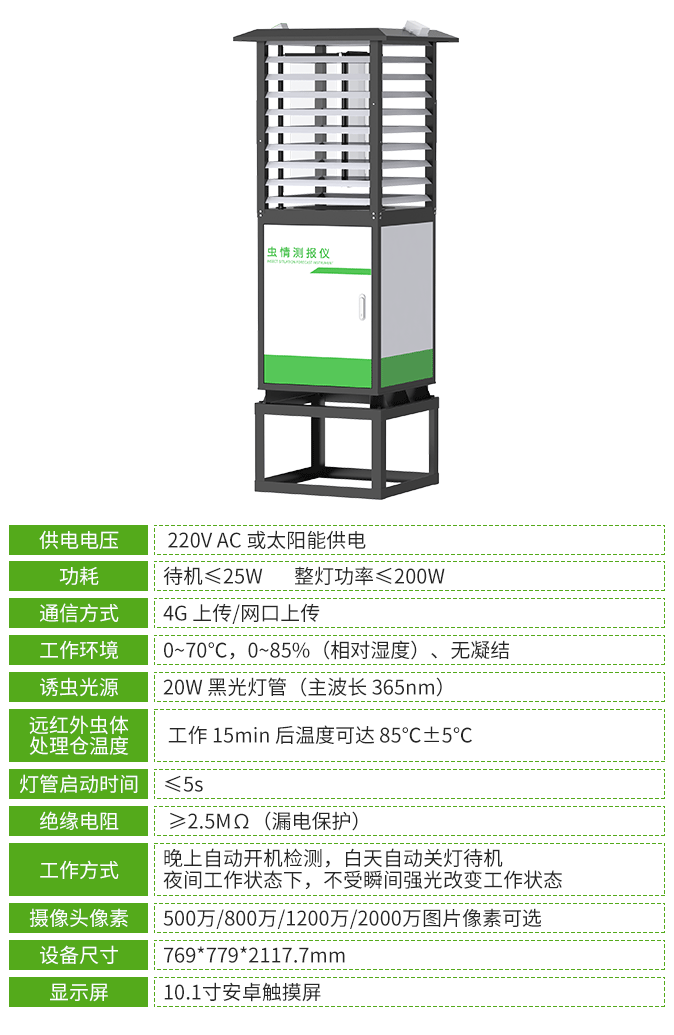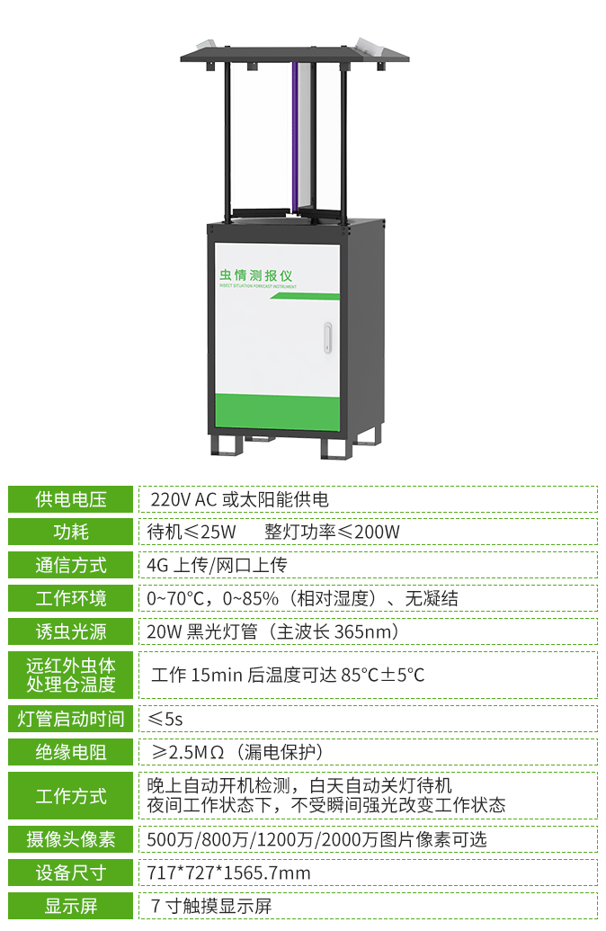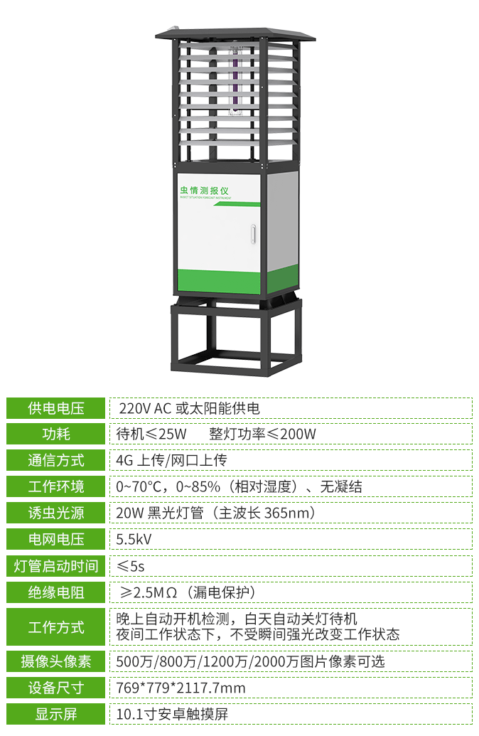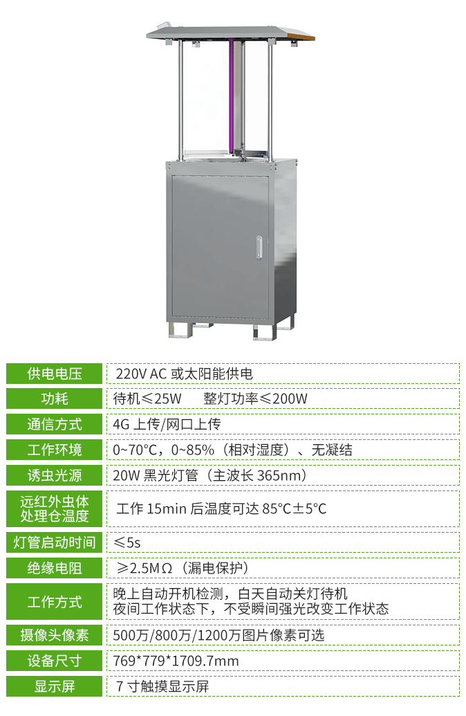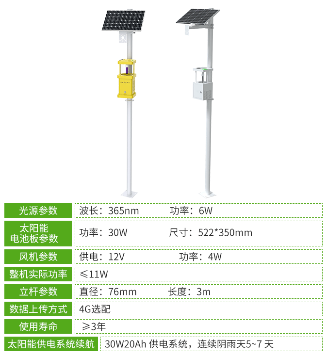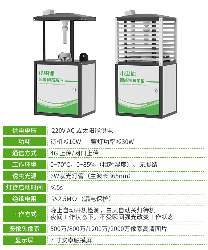 殺蟲燈設備采用廣譜(波長320nm-680nm多光譜誘蟲光源)誘蟲方式,擁有外配以頻振高壓電網觸殺的頻振式殺蟲燈和利用風機轉動產生負壓氣流將蟲子吸入到收集器中,使之風干、脫水,達到殺蟲目的的風吸式殺蟲燈,客戶可按需選擇。