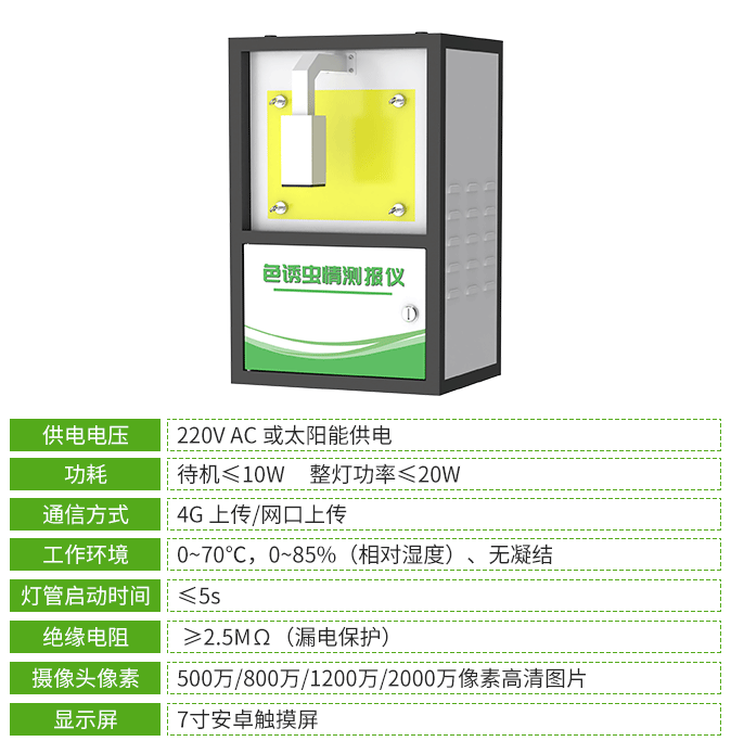 色誘蟲情測報儀采用可定期更換的黃、藍、綠三色粘蟲板,專門誘捕具有趨色性的飛行或爬行類害蟲。設備基于溫控、時控及平臺聯網控制技術,結合機械組件與高清攝像頭,可在無人值守狀態下自動完成害蟲誘捕滅殺和定時圖像采集等系統作業,并上傳至農業云平臺。農業云平臺可對蟲害圖像進行AI自動識別、統計分析和報表生成,實現對蟲害發生發展態勢的精準預測。色誘蟲情測報儀具有蟲害標本采集和蟲情分析預測的雙重功能,可為現代農業提供智能化蟲害監測解決方案。