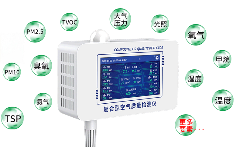 多功能空氣質量變送器與復合型空氣質量檢測儀可以全面監測空氣質量參數,支持對溫度、濕度、顆粒物(PM2.5、PM10、TSP)、大氣壓力、光照、噪聲以及TVOC、CO2、甲醛、O3、CO等多種空氣質量相關要素進行監測。設備還采用了模塊化的設計,用戶可根據實際需求選擇監測要素。