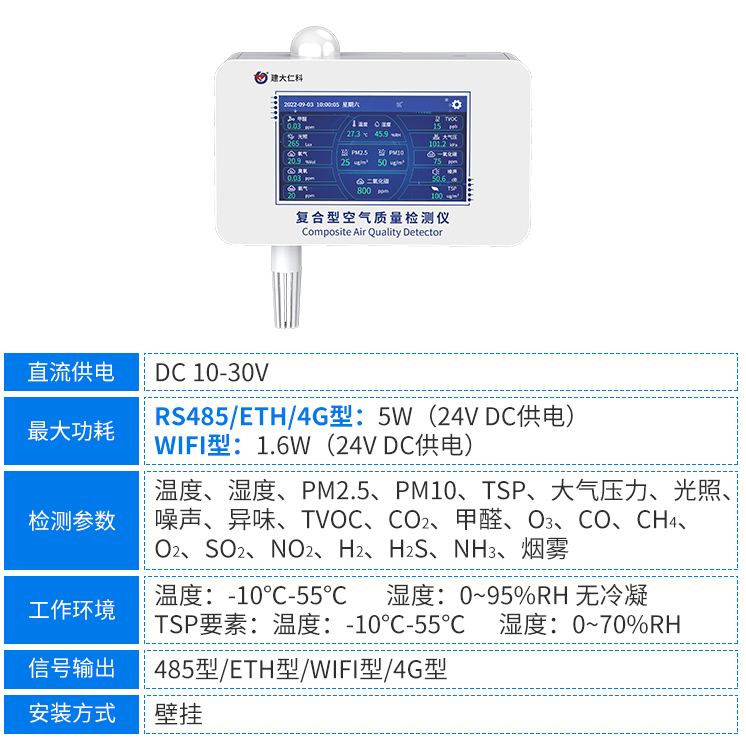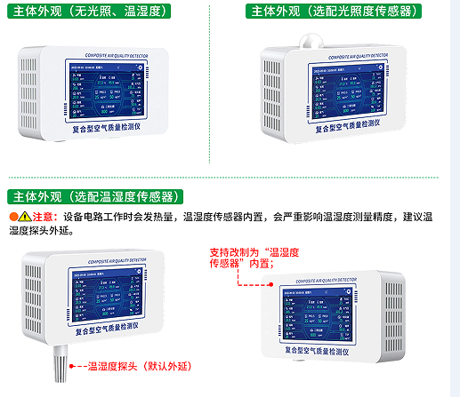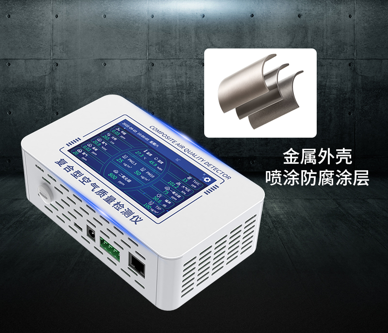 復合型空氣質量檢測儀使用金屬殼體,并在殼體表面噴涂白色亞光防腐涂層。
