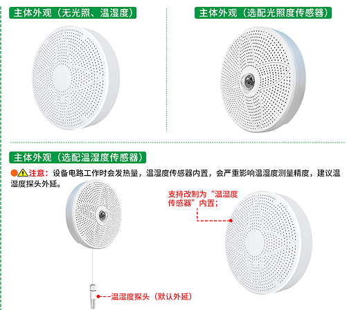 當選配光照監測參數時,設備表面會安置一個全透明的球狀光照傳感器,確保傳感器能全方位直接感知光線,使光照監測數據更加真實可靠。當選配溫濕度監測參數時,會外延一個溫濕度探頭以精準監測環境中的溫濕度數據,避免因設備運行發熱影響溫濕度傳感器的測量精度。