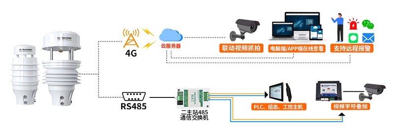 超聲波氣象監測設備支持通過4G、RS485的方式將數據上傳環境監控云平臺或用戶自己的本地監控平臺,兩種傳輸方式可適配不同的使用場景以保障數據上傳的穩定與及時。用戶可根據實際使用場景靈活選擇,為后續的智能監測奠定基礎。