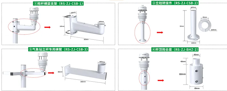 02  高級款設備在基礎款上額外配備立柱轉接件、氣象站立桿專用橫臂等安裝配件。