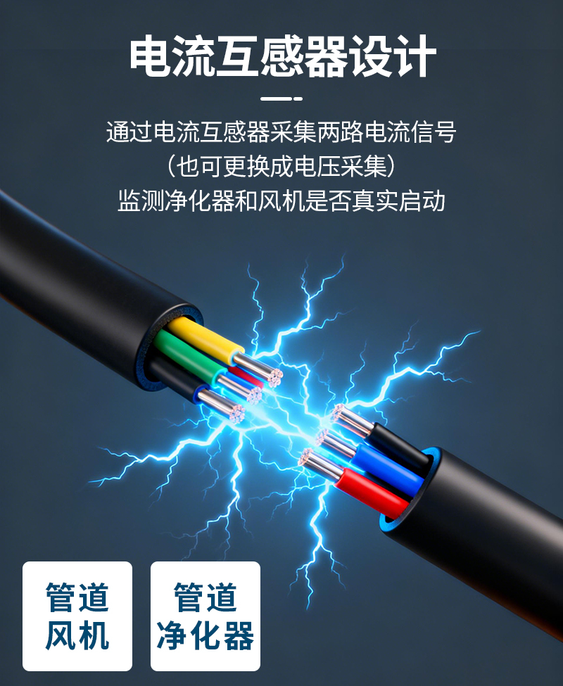 國(guó)家對(duì)餐飲企業(yè)進(jìn)行監(jiān)管時(shí),為了防止餐飲企業(yè)不啟動(dòng)風(fēng)機(jī)和凈化器,還會(huì)要求在上傳油煙濃度、顆粒物濃度、非甲烷總烴濃度的同時(shí)上傳風(fēng)機(jī)和凈化器的狀態(tài)。油煙檢測(cè)儀完全遵循政府監(jiān)管的要求,能夠通過(guò)電流互感器采集兩路電流信號(hào)(也可更換成電壓采集),以此監(jiān)測(cè)風(fēng)機(jī)和凈化器是否真實(shí)啟動(dòng)。