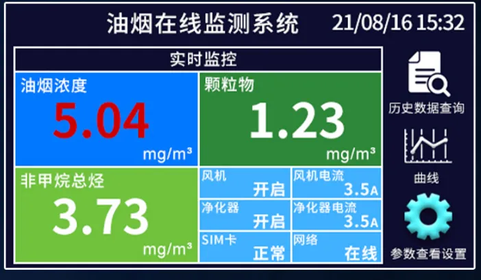油煙檢測(cè)儀配備大屏觸摸屏,屏幕上可以實(shí)時(shí)直觀展現(xiàn)“當(dāng)前時(shí)間、sim卡狀態(tài)、網(wǎng)絡(luò)狀態(tài)、油煙濃度、顆粒物濃度、非甲烷總烴(NMHC)濃度、風(fēng)機(jī)及凈化器運(yùn)行狀態(tài)”等相關(guān)信息。 用戶還可通過(guò)觸控顯示屏實(shí)時(shí)查詢“油煙濃度、顆粒物濃度、非甲烷總烴濃度”的“歷史數(shù)據(jù)、近1h的曲線分析圖”。 此外,支持設(shè)置“系統(tǒng)工作時(shí)間段、通訊參數(shù)、隔膜泵啟停邏輯”等相關(guān)參數(shù)。