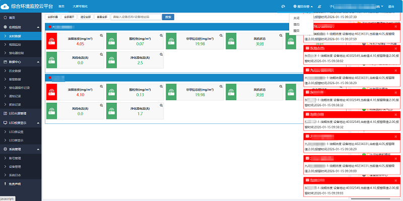 環(huán)境監(jiān)控云平臺(tái)擁有多種告警方式,當(dāng)油煙檢測(cè)儀監(jiān)測(cè)到的數(shù)據(jù)超過(guò)上限時(shí),平臺(tái)會(huì)以數(shù)據(jù)變紅、彈窗、聲音等形式提醒,還可以觸發(fā)短信、語(yǔ)音、郵件、微信推送等方式進(jìn)行遠(yuǎn)程告警,并自動(dòng)記錄告警信息,方便用戶隨時(shí)查詢。