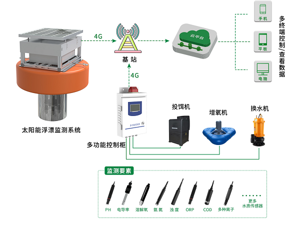 智慧水產養殖監測系統主要由水質在線監測系統——太陽能浮漂水質監測站、智能控制系統、以及綜合環境監控云平臺組成。