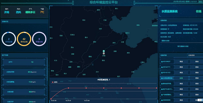 監測效果:通過在重要的水域安裝水質PH、溫度二合一變送器對水域PH進行實現監測,針對不同的使用環境,我們有常規復合電極、平面脫硫電極、四氟電極、電鍍電極、玻璃電極、銻電極供用戶自行選擇。變送器通過RS485智能接口及通訊協議接入氣象監控主機,由4G無線傳輸將數據上傳至環境監控云平臺進行實時監測。當任一水域中PH、溫度值超過設置的上下閾值時,系統自動觸發短信、語音、郵件告警,通知管理人員緊急處理。