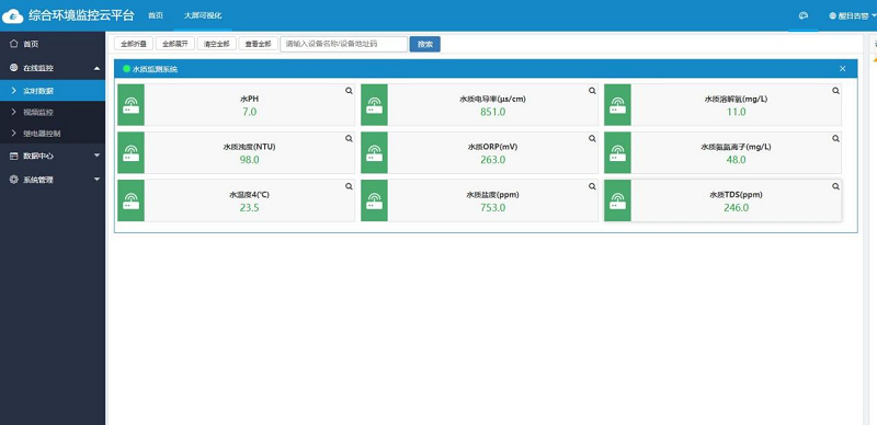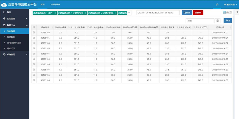 平臺支持實時查看所測水環境數據。數據可以通過圖形化界面、列表等方式反映,圖形化界面的優勢在于讓用戶直觀看到數據和傳感器相對位置,列表則更利于用戶對數據進行對比。