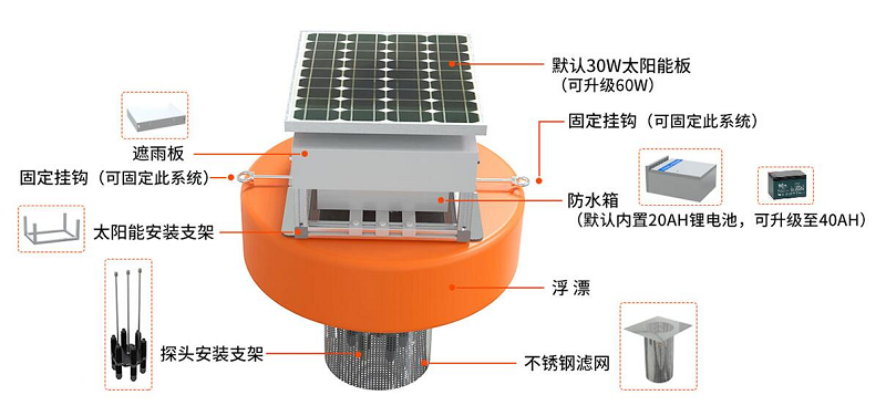 太陽能浮漂系統由基礎支架、供電系統、監測系統三部分組成,適用于水產養殖、污水處理、公園水質、野外地表水質等不易進行立桿安裝、市電供電或水面較廣的場合使用。